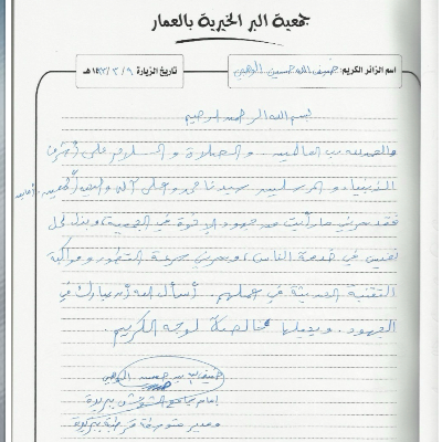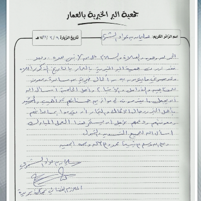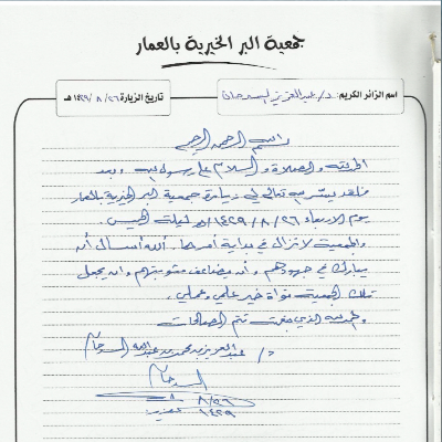 الحمد لله وحده والصلاة والسلام على من لابنى بعده . وبعد فقد زرت جمعية البر الخيرية بالعمار بالتاريخ المذكور أعلاه وقد سرني ما يقومون به من أعمال خيرية من مساعدة ومعونة للمحتاجين والأرامل الأيتام وأهل الحاجة ..